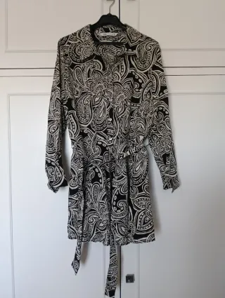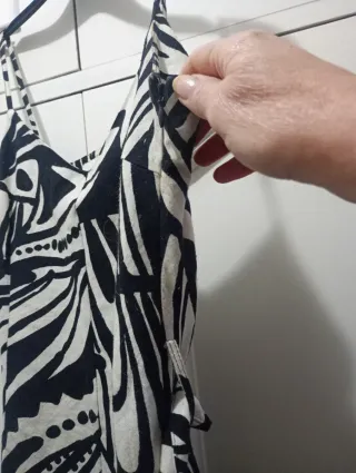 Vestido de Zara con un llamativo estampado. - Diseño con tirantes finos. - Largo midi. - Estampado abstracto en blanco y negro. Lleva una apertura en la parte de adelante también lleva cinturón que te lo puedes poner atado adelante o detrás y cremallera en el lateral.