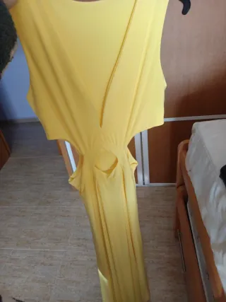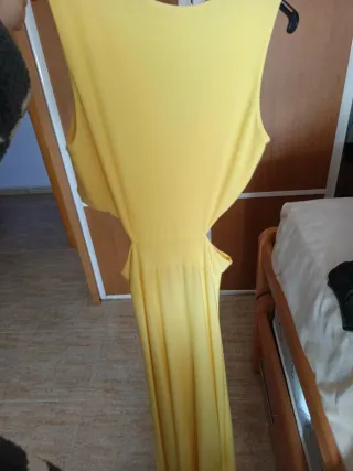 Vestido largo de color amarillo con un diseño moderno y elegante. - Escote pronunciado en V. - Aberturas laterales. - Corte ceñido en la cintura. - Falda larga y fluida.