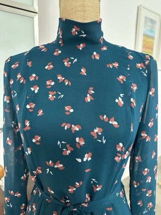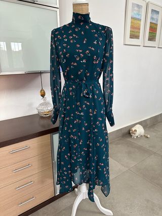 Elegante vestido de gasa con un bonito estampado floral. Ideal para cualquier ocasión. Bajo asimetrico, muy favorecedor, imoecable, el maniqui es talla M, el vesrido es talla 4, puede servir L - Diseño de cuello alto. - Manga larga. - Cinturón a juego. - Largo midi.