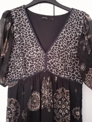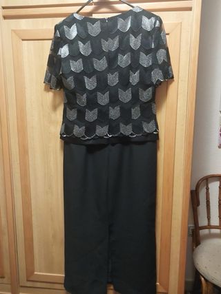 Precioso vestido negro con transparencias y estampado de leopardo de terciopelo (las manchitas de leopardo son de terciopelo), nuevo completamente, con espalda en pico que queda muy bonita, más largo por detrás. Ancho 50 cm. Por delante el largo son 87 cm, por detrás 1 metro y 5 cm.
