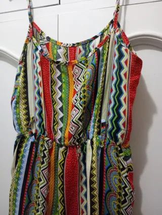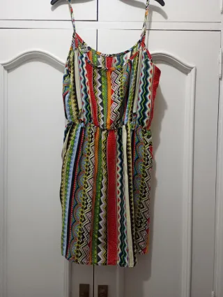 Vestido corto con un llamativo estampado. - Diseño con tirantes finos. - Cintura elástica para un ajuste cómodo. - Largo por encima de la rodilla. Lleva bolsillos laterales y trabillas por si se pone cinturón.
