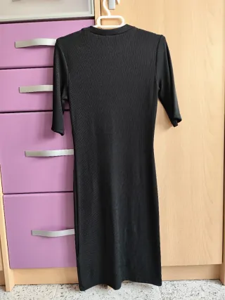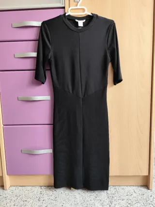 Vestido negro de H&M con un diseño moderno y elegante. - Corte recto, entallado y de punto de canalé - Manga 3/4. - Tejido con textura. - Largo hasta la rodilla. - Talla S