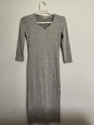 Vestido largo de canalé en color gris. Es un vestido ajustado y elegante. - Manga larga. - Cuello redondo. - Largo hasta los tobillos.