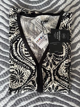 Es precioso, totalmente nuevo. Vestido camisero, 100% algodón, mide 55 cm de axila a axila, 45 cm en cintura y luego va con vuelo, para contorno de cadera máximo de 120 cm. De largo mide 85 cm. También se puede llevar abierto tipo camisola sobre un pantalón y top negro!!! 😻