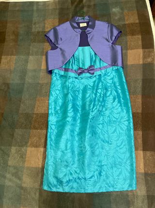 Elegante conjunto de vestido y torera. - Vestido largo de tela con estampado floral. - Torera corta de manga corta. - Detalle de lazo en la cintura del vestido.