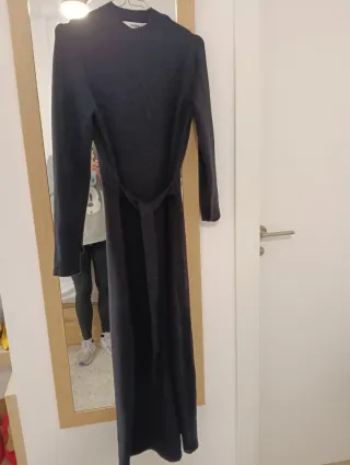 Vestido largo de punto en color negro, manga larga y cuello redondo. Tiene un cinturón a juego para ceñir la cintura y apertura en un lateral de la falda. Super suave y perfecto para esta época. Poliester, nylon y viscoso. Sin usar (se vende por talla inadecuada)