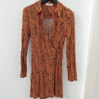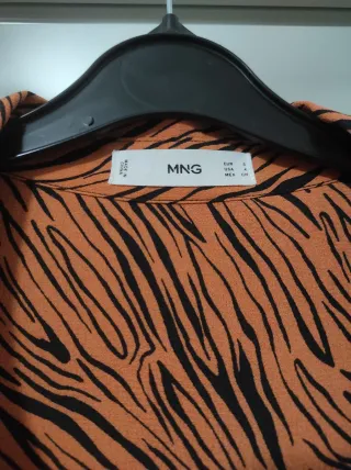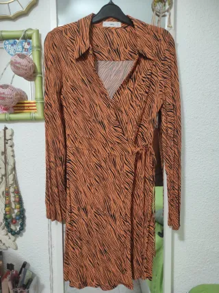 Vestido cruzado con estampado de tigre de Mango. Talla S. - Manga larga. - Cuello camisero. - Cintura elástica con cordón ajustable.
