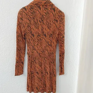 Vestido con estampado animal print en tonos naranja y negro. - Diseño cruzado. - Manga larga.