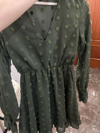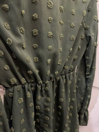 Vestido de manga larga con un favorecedor escote en V y detalle de lunares texturizados. - Diseño con cintura elástica. - Mangas abullonadas con puños. - Bajo con volantes.