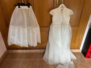 Conjunto de vestido de comunión blanco con chaquetilla a juego. Ideal para una ocasión especial. TALLA: 106cm - Vestido largo con detalles de tul. - Chaquetilla corta de encaje. - Cinturón decorativo con flor. - Incluye cancan.