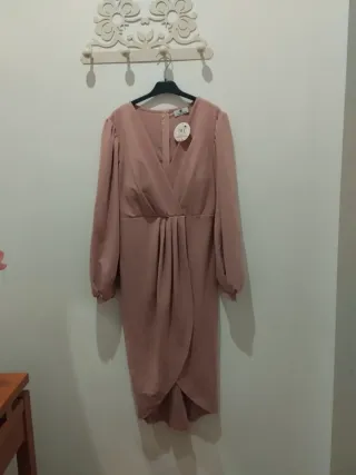 Vestido midi para eventos en color rosa clarito. Talla S. Marca Mariquita Trasquilá. Manga larga y abullonada. Escote cruzado en forma de V. Cintura drapeada. Falda con abertura. Con cascos en el pecho.Está nuevo, con etiqueta.