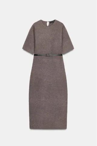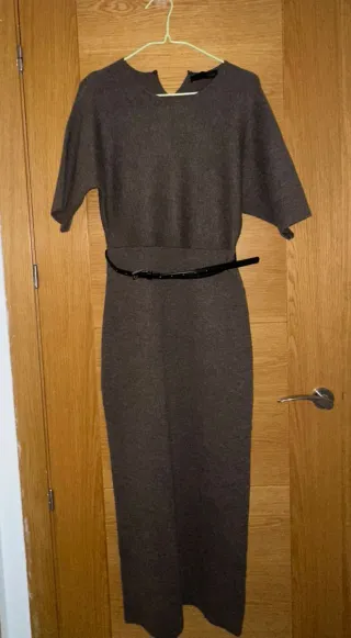 Vestido midi de punto de Zara en color marrón. Incluye el cinturón fino negro. - Manga corta. - Largo midi.