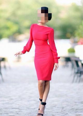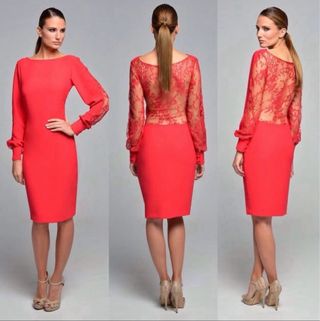 Espectacular vestido rojo de corte recto, manga larga abullonada, escote cerrado estilo barco y espalda en encaje transparente, de la diseñadora sevillana Maria Jose Suárez. Un modelo que oscila entre lo clásico y lo vanguardista, gracias a su atrevido detalle en la espalda. Es una preciosidad , sienta de escándalo y tiene solo una puesta.