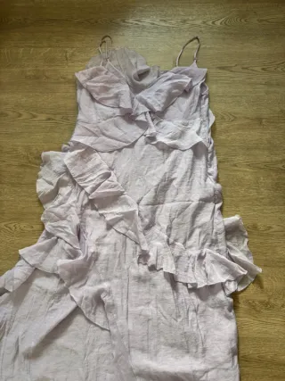Vestido de tirantes y largo asimétrico. - Tiene volantes por todo el vestido. - Cremallera en la parte lateral. - Tela ligera, no transparenta. - Solo ha sido usado en una ocasión, no tiene desperfectos.