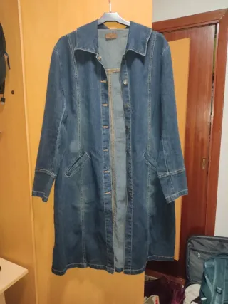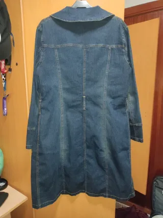 Chaqueta vaquera larga/vestido camison (estilo trench denim) azul clásico. Muy versátil, ideal para entretiempo y para llevar abierta con vestidos, pantalones o looks casuales. Corte recto, bolsillos laterales y botones frontales.