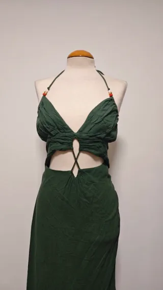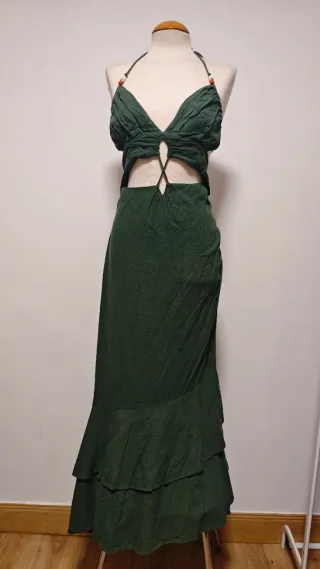Vestido largo de color verde con un diseño moderno y favorecedor. - Escote halter con detalle de cuentas. - Corte cut-out en la cintura. - Falda con volantes escalonados.