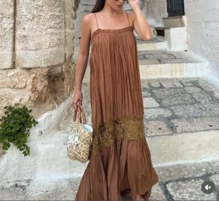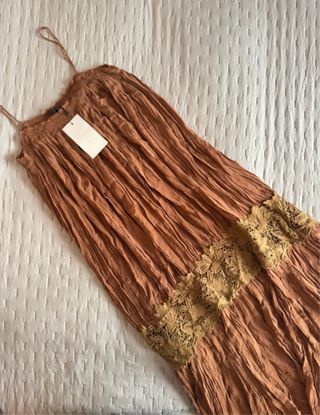 Vestido largo de tirantes finos con un diseño plisado y detalle de encaje en la parte inferior. - Tirantes finos. - Diseño plisado. - Detalle de encaje en el bajo.