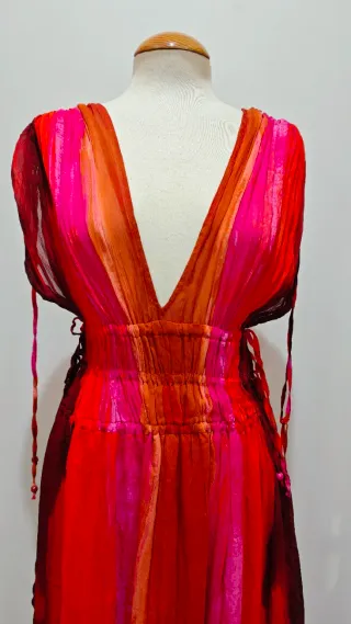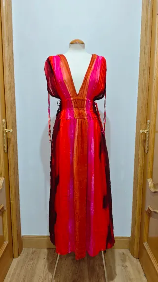 Vestido largo con un estampado vibrante y fluido. - Diseño con escote pronunciado en V. - Cintura elástica para un ajuste cómodo. - Mangas cortas y fluidas. - Tiras de ajuste en los laterales.