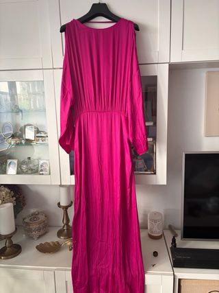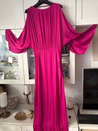Elegante vestido largo de color fucsia, con un diseño especial. - Corte midi. - Mangas acampanadas y escote espalda. Comprado para una boda y finalmente no utilizado.