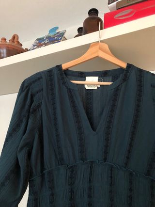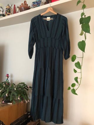 Elegante vestido largo de Indi & Cold en un bonito tono verde oscuro. Presenta un delicado bordado a lo largo de la prenda que le da un toque especial. - Diseño maxi. - Mangas largas. - Escote en V. - Cintura elástica. - Falda con volantes. Muy facil llevarla si eres talka mas grande