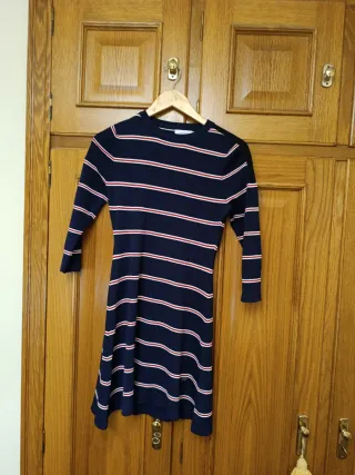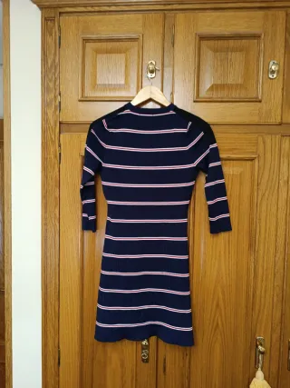 Vestido de punto con un diseño de rayas clásico. - Mangas tres cuartos. - Cuello redondo. - Largo hasta la rodilla.