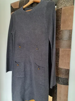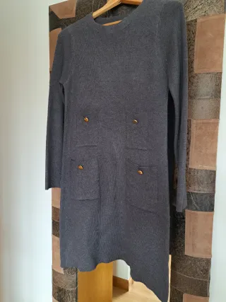 Vestido de punto de manga larga con un diseño moderno y detalles de bolsillos. - Tejido de punto suave. - Dos bolsillos frontales con botones dorados. - Corte asimétrico en el bajo.