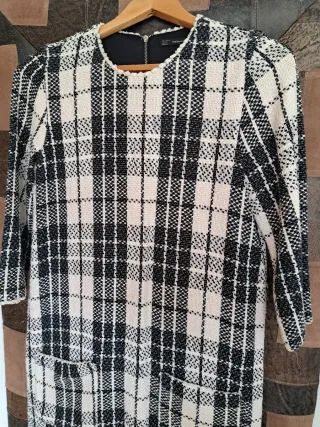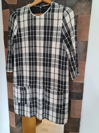 Maxi vestido de Zara talla S, corte ancho. Lo vendo porque me queda demasiado grande. Largo casi hasta los tobillos,yo mido 1,69. Punto fino. Blanco y negro. Casi no lo he usado. - Diseño de rayas horizontales. - Manga larga. - Corte recto.