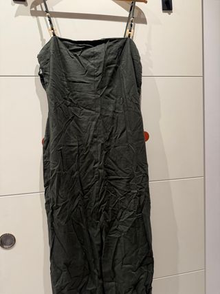 Vestido largo de color verde oliva con una abertura. - Tirantes finos con detalles. - Diseño recto. Disculpe las arrugas, con placha sale, lo he tenido guardado desde hace rato, y solo lo use 1 ves