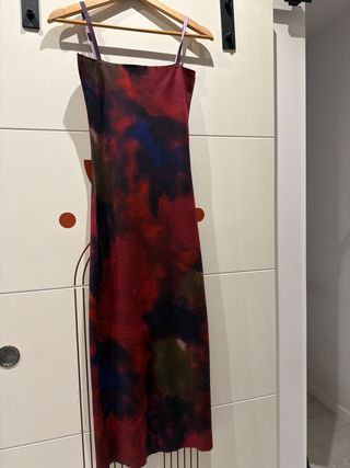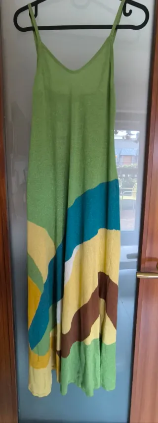 Vestido largo de punto fino, perfecto para el verano. - Para cualquier uso: diario o de ocasión. - Se adapta al cuerpo y aunque es talla XS lo puedes llevar hasta con L. - Escote delantero y trasero muy bonito. - Tejido ligero y transpirable. - Estampado abstracto con formas orgánicas. - Tirantes finos para mayor comodidad.