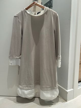 Vestido de Zara de corte recto y manga larga. Presenta un detalle de cuello camisero y un bajo asimétrico. - Cuello camisero. - Manga larga con puño. - Bajo asimétrico.