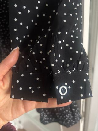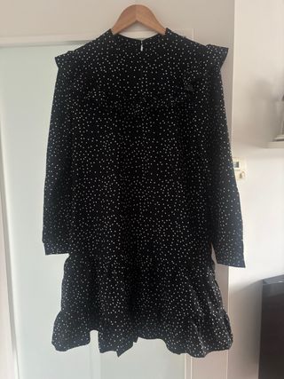 Vestido negro con un bonito estampado de lunares blancos. Tiene volantes en los hombros y en el bajo. - Manga larga. - Cuello cerrado con botón. - Bajo con volante.