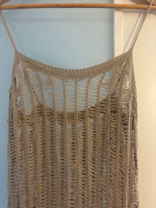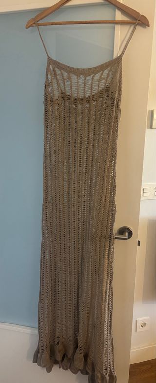 Vestido largo de estilo playero en color beige. Su tejido de punto calado lo hace ideal para llevar sobre el bañador. - Diseño largo hasta los tobillos. - Tirantes finos. - Detalle de volantes en el bajo.