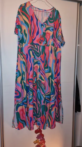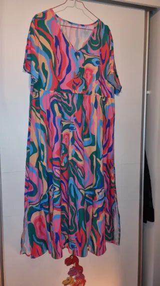 Vestido largo con un llamativo estampado abstracto. Es XL pero es talla Grande como una XXL - Diseño con escote en V - Cintura elástica - Mangas cortas - Bajo con aberturas laterales