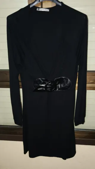 Elegante vestido negro de manga larga. - Diseño con detalle en la parte inferior. - Tejido ligero y fluido. Con tiras abordadas por bajo abertura atrás con motores forrado varias tallas