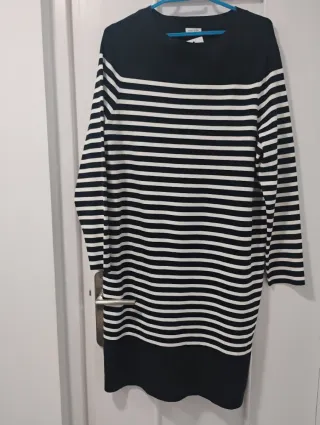 Vestido largo de punto con un diseño de rayas horizontales. - Manga larga. - Cuello redondo. - Largo hasta la rodilla.