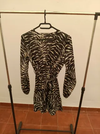 Vestido corto con estampado de cebra. Talla única equivalente a una M. Utilizado solo dos veces. Tienda local. Su precio de compra fue 35€. - Manga larga. Con goma en el puño. - Cinturón para ajustar (opcional).