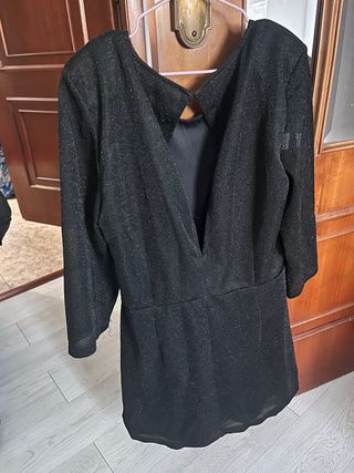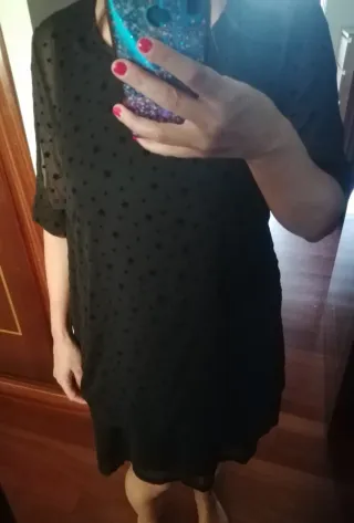 Vestido corto talla M de Mango, en color negro con estrellitas negras de terciopelo, manga corta, cuello redondo, diseño de dos capas en tejido vaporoso con forro interior de tela que no pega al cuerpo. Medidas: largo 85cm, ancho 90-1,20 cm. Lo he usado solo la navidad pasada. Está como nuevo, sin etiquetas, muy cómodo al ser flojito. Ideal nochevieja.