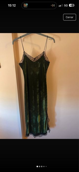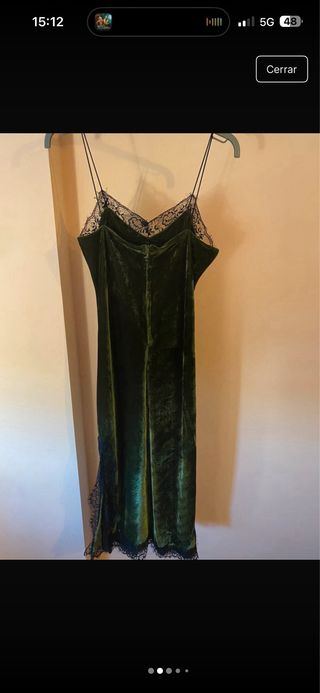 Vestido estilo lencero de terciopelo. - Diseño largo. - Detalle de encaje en escote y bajo. - Tirantes finos. - pequeña abertura