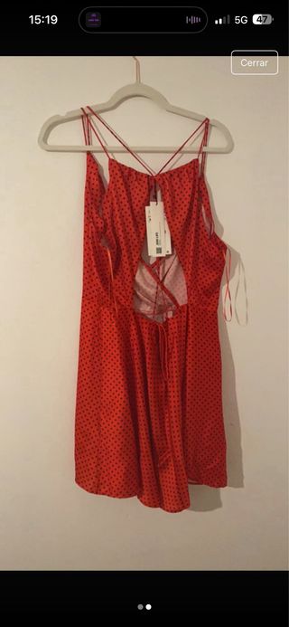 Vestido de Zara con un estampado de lunares. - Diseño con tirantes finos. - Escote cruzado. - Largo mini.