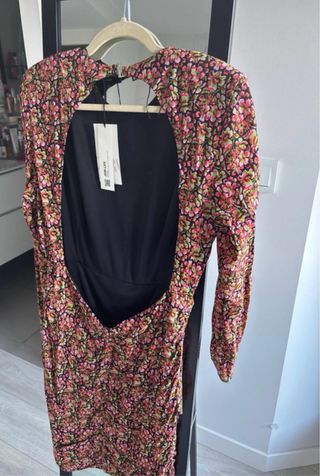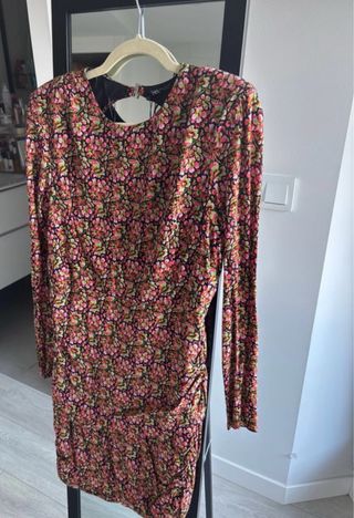 Vestido de Zara con estampado floral y manga larga. Presenta un detalle de espalda descubierta y fruncido lateral. - Estampado floral vibrante. - Manga larga. - Espalda descubierta con cierre. - Detalle fruncido en el lateral.