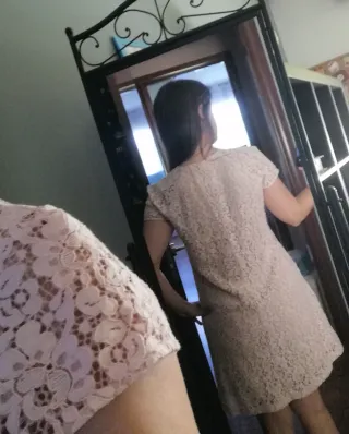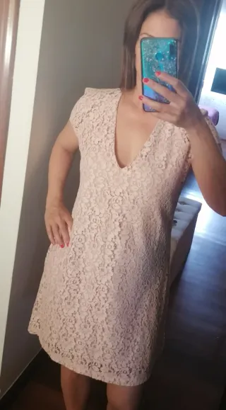 Vestido corto talla S de Zara Woman de encaje floral en color rosa con manga corta y escote en pico, forro interior de tela no pegajoso. Medidas: largo 85cm, ancho 90-1,20 cm. Es una prenda delicada y femenina, ideal para ocasiones especiales y eventos formales o informales. Solo lo he puesto una vez.