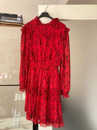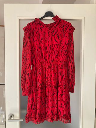 Vestido con un estampado divertido y original. - Diseño con volantes en el hombro. - Manga larga. - Largo hasta la rodilla. - Depende de los complementos puede ser de diario o para vestir.