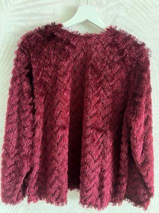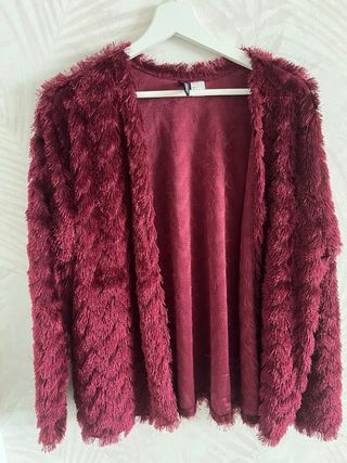 Chaqueta de fiesta de H&M, color burdeos/granate, talla L. Tejido con efecto pelo largo/flecos, muy elegante y llamativa. Ideal para: • Fiestas y eventos • Cenas, Navidad, Nochevieja • Looks de noche con vestido o top básico ✔️ Muy poco uso ✔️ En muy buen estado ✔️ Hogar sin humo ni mascotas 📦 Se envía por Wallapop