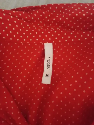 Vestido de manga larga con un estampado de lunares blancos sobre fondo rojo. El diseño es elegante y versátil. - Cuello camisero. - Cierre de botones. - Largo hasta la rodilla.