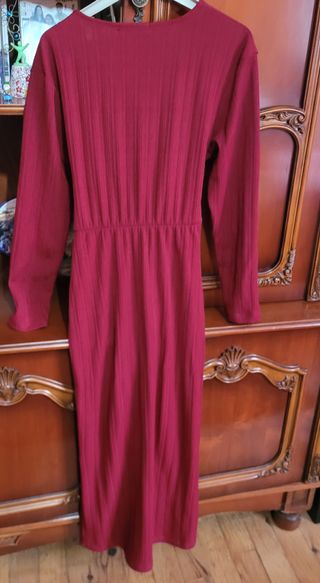 Vestido largo de manga larga con un diseño drapeado y fruncido en la cintura. Es anaranjado. Se ha usado en dos ocasiones y en ambas ha sido lavado en tintorería. Lo compré en Vuelve Marcela, tienda de San Sebastián. - Diseño cruzado en la parte delantera. - Largo midi. - Tejido elástico.