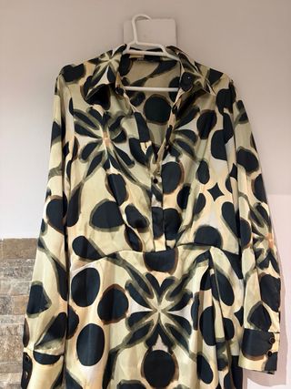Elegante vestido satinado con un llamativo estampado. - Diseño con cuello camisero. - Manga larga. - Cierre de botones. Vestido satinado nuevo de la marca Zara talla M