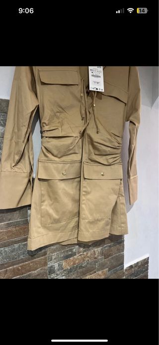 Vestido de manga larga con un diseño moderno y favorecedor. - Cierre de cordones en la parte delantera. - Dos bolsillos de parche en el pecho. - Detalle fruncido en la cintura. - Puños abotonados. Vestido beige con cordones y bolsillos nuevo con etiquetas marca Zara talla XS. 100% algodón. Precio original 39,95€. Precio negociable