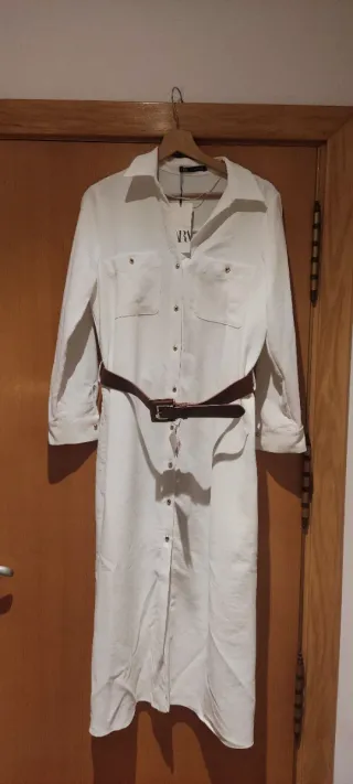 Vestido largo de la marca Zara en color blanco. Presenta un diseño camisero con botones frontales y cinturón. - Cuello camisero. - Cierre de botones. - Cinturón a juego. - Bolsillos en el pecho.