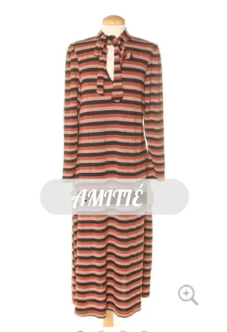 Vestido de manga larga con estampado de rayas y detalles de lurex. - Cuello alto con lazada. - Diseño de rayas horizontales en tonos naranja teja, negro y beige. metálicos. largo con estampado de rayas finas y detalles brillantes. Tiene cuello con lazada. - Diseño de rayas verticales. - Tejido con hilo metalizado.