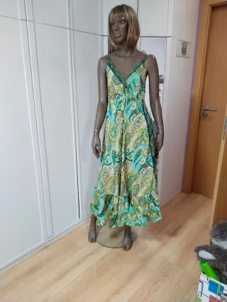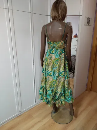 Vestido largo con un bonito estampado,solo dos puestas,seda 100%. Se ajusta con una lazada que lleva en el pecho,se ve en la fotografía. Yo llevo una XS,pero se ajusta hasta una M. - Diseño con tirantes finos. - Escote en V. - Largo hasta los tobillos. - Estampado paisley en tonos verdes y multicolor.